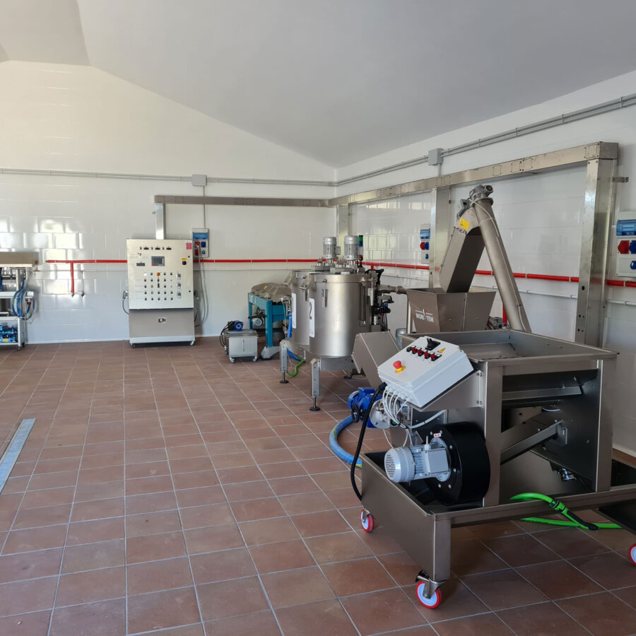 Nous avons construit et totalement équipé notre propre moulin ; une ligne de fabrication d’huile d’olive moderne, pouvant presser jusqu’à 350 Kg/heure, et qui comprend :