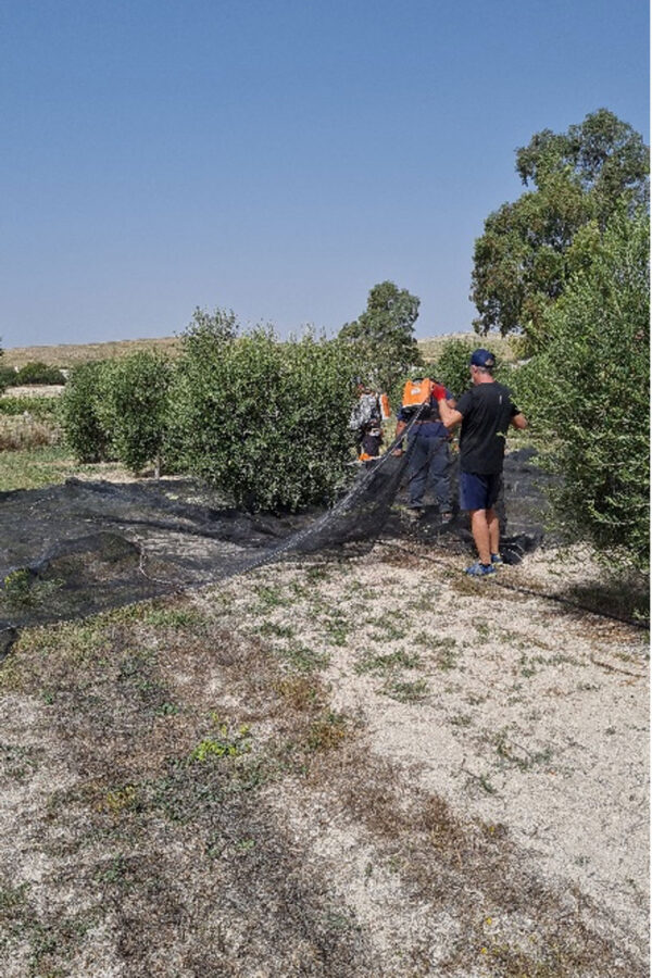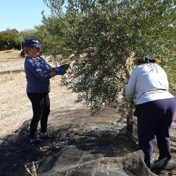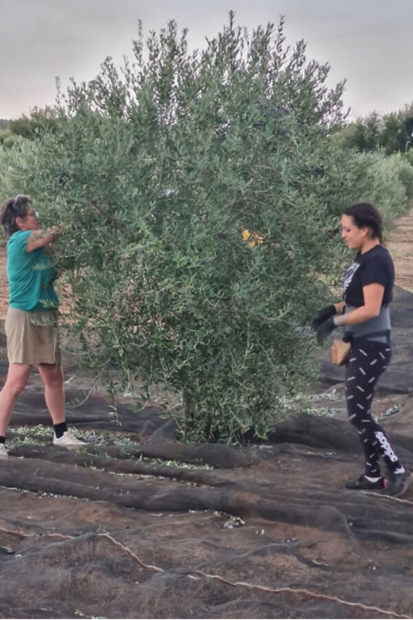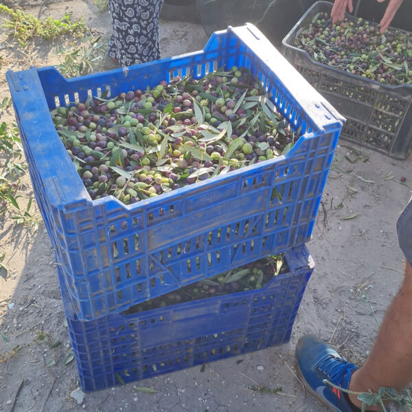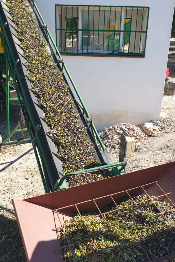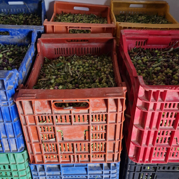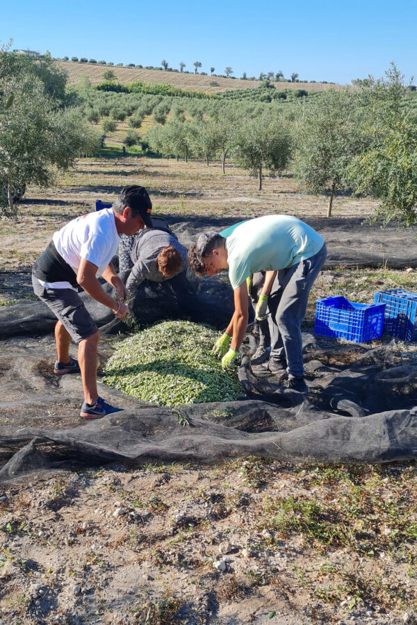Il s’agit d’une récolte essentiellement manuelle, parfois aidée d’une perche mécanique : nous traitons les fruits de la manière la plus délicate possible pour éviter les blessures, et ramenons la récolte au moulin au plus vite.